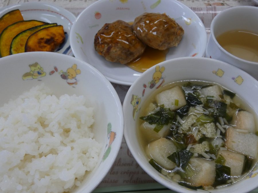今日のメニューは「ご飯、豆腐ハンバーグ(豆腐)照り焼きソース、かぼちゃチップ、麩のすまし汁(えのき)」でした。