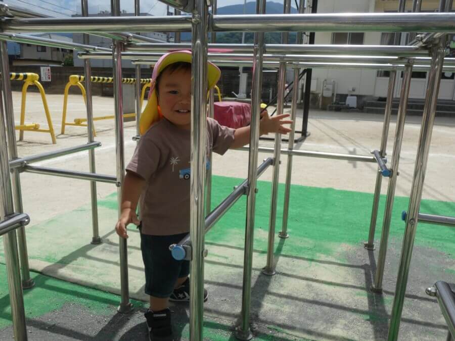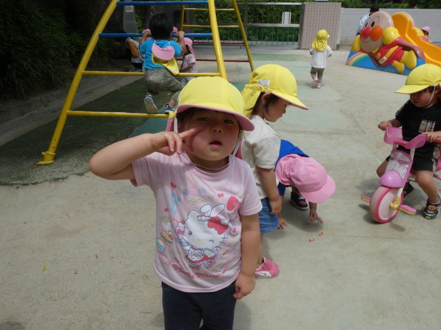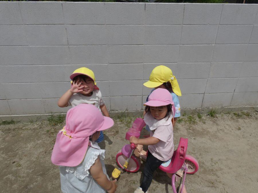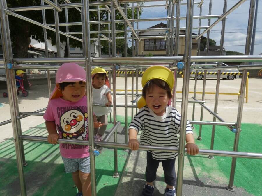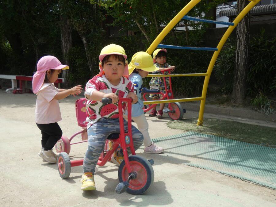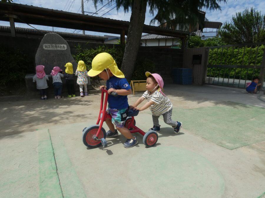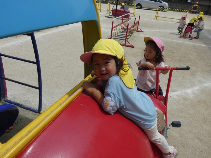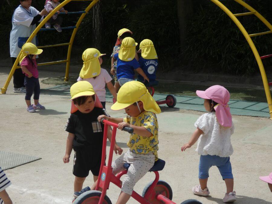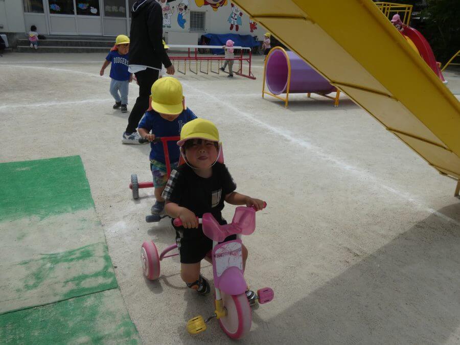 避難訓練の後、桃1組さんと桃2組さんが園庭で外遊びをしました。ジャングルジムやビートルで遊んだり、三輪車に乗って遊んだりしました。たくさん体を動かしました。体を動かした後は、水分もしっかりと補給しました。