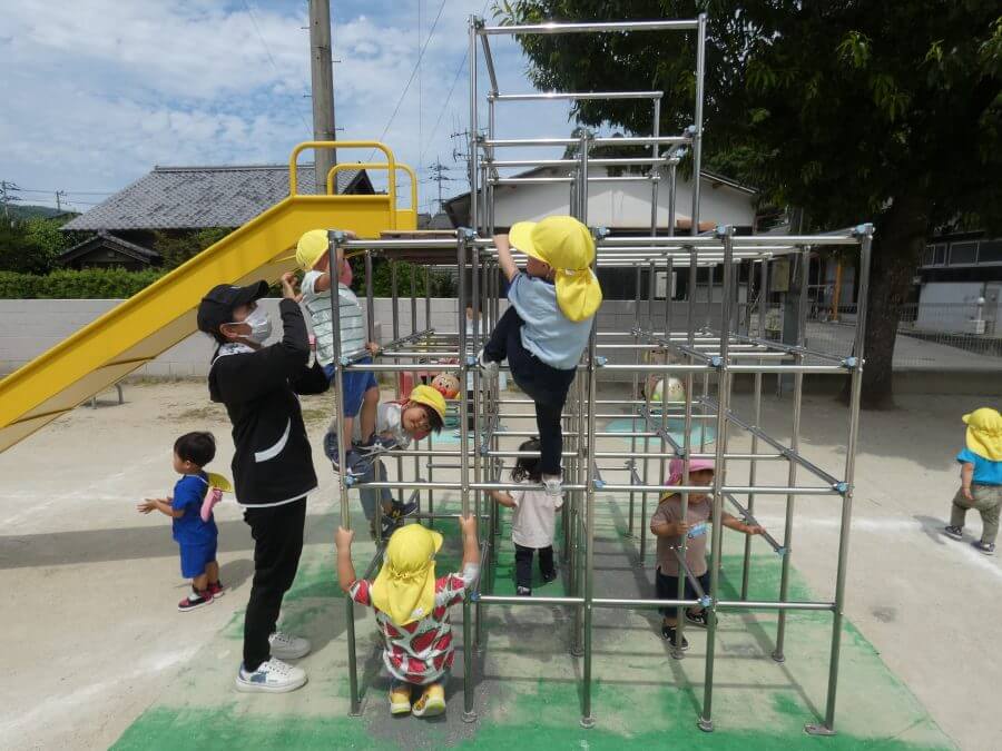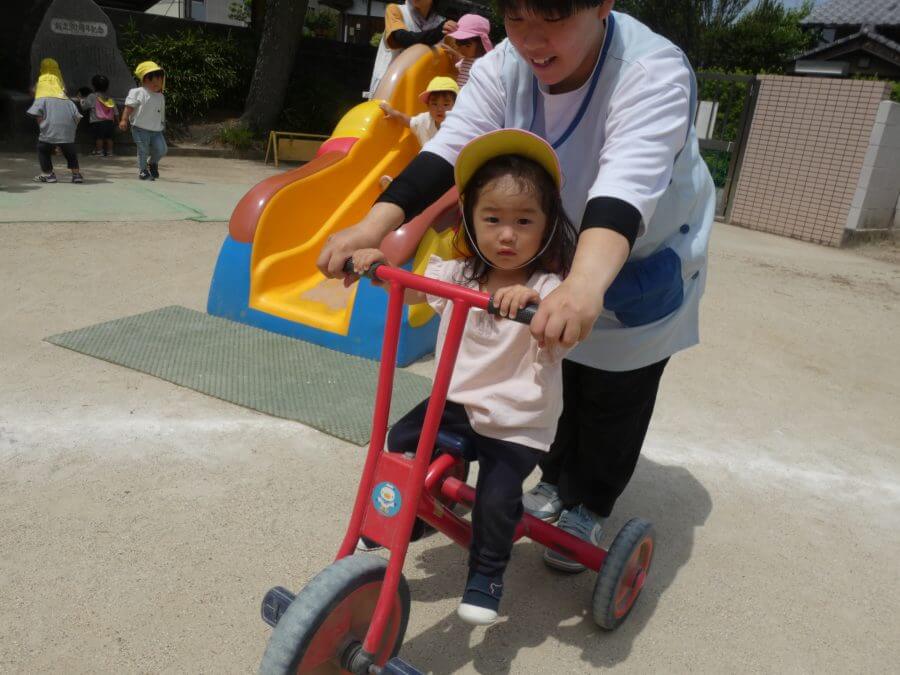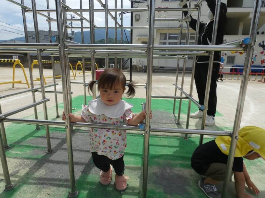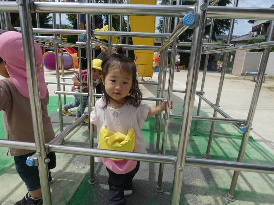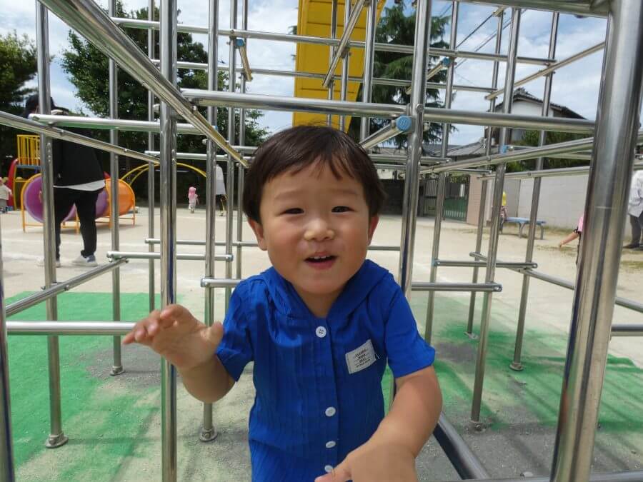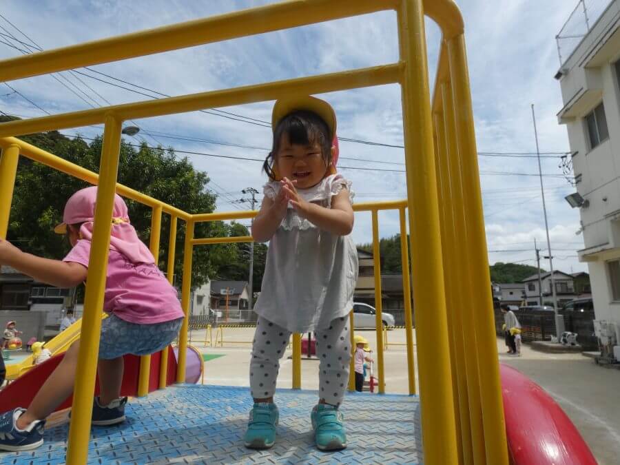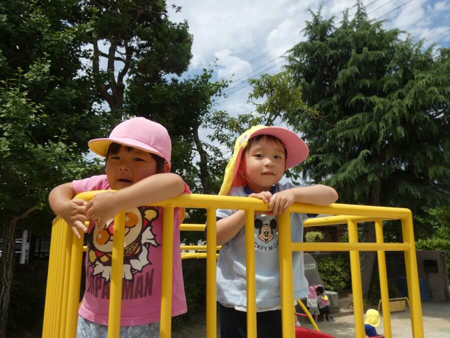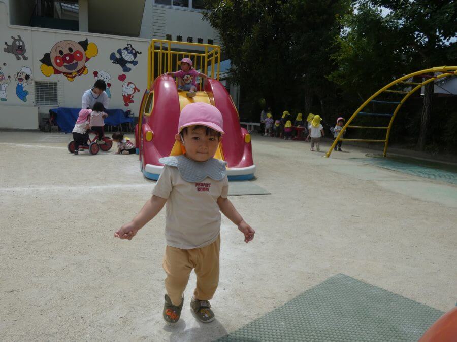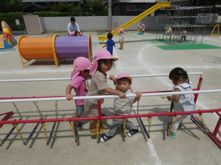避難訓練の後、桃1組さんと桃2組さんが園庭で外遊びをしました。ジャングルジムやビートルで遊んだり、三輪車に乗って遊んだりしました。たくさん体を動かしました。体を動かした後は、水分もしっかりと補給しました。
