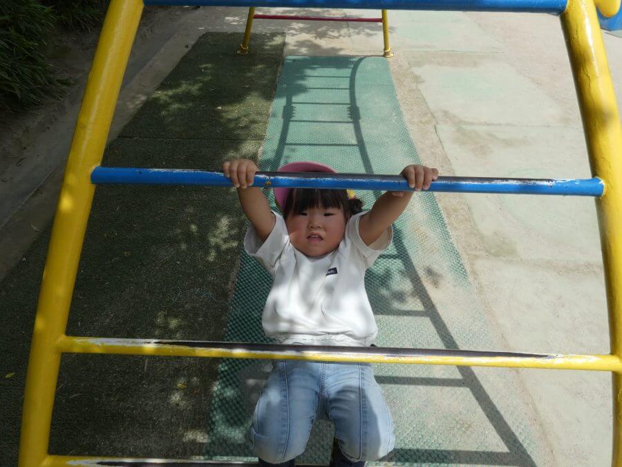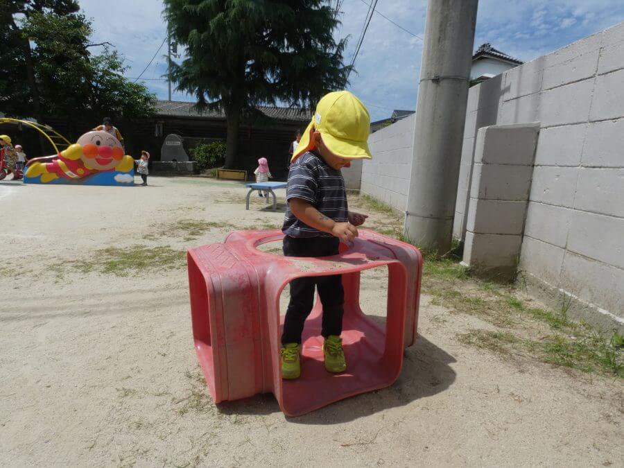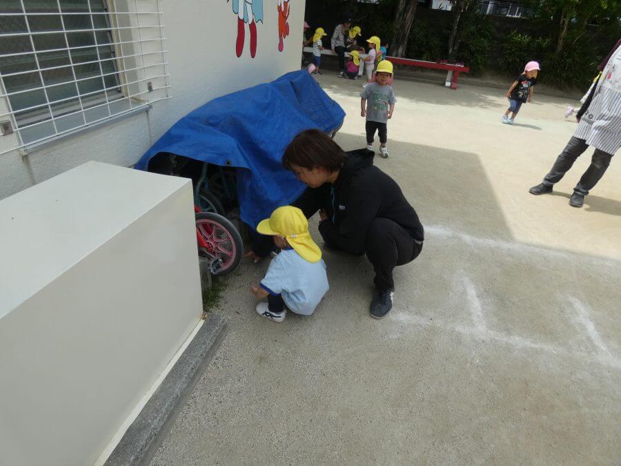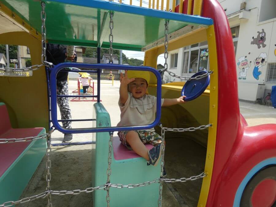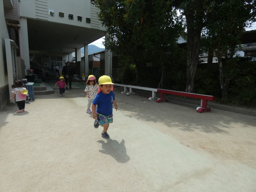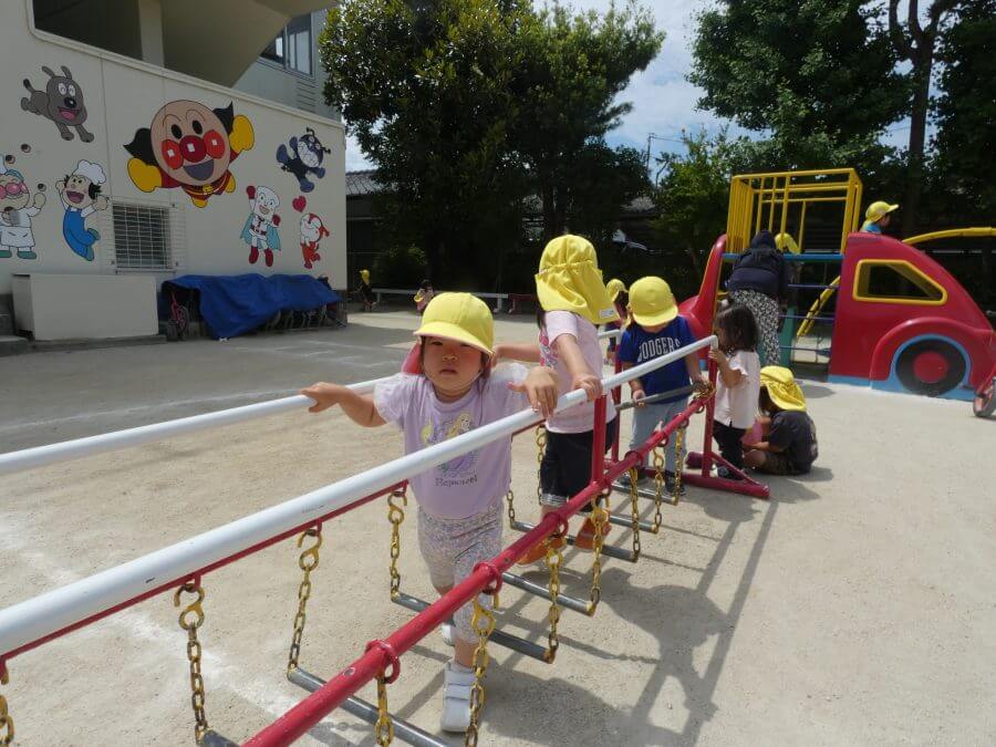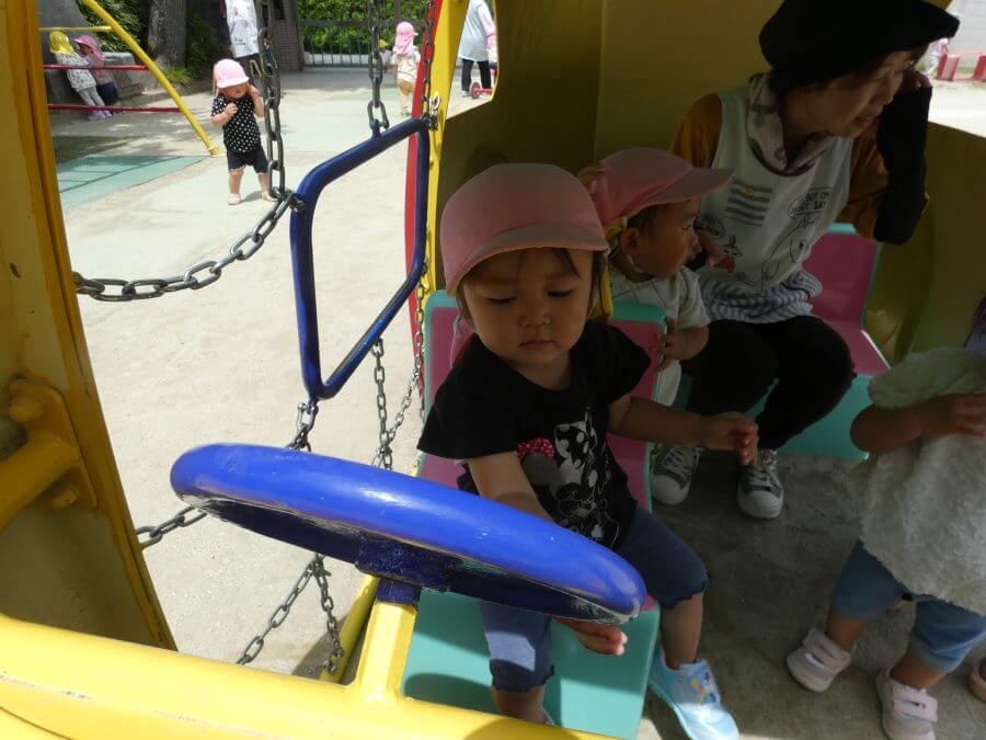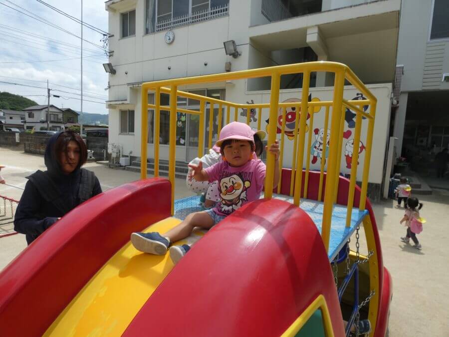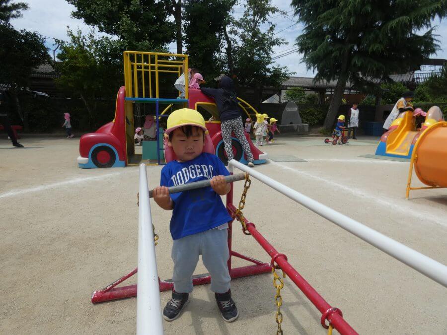 避難訓練の後、桃1組さんと桃2組さんが園庭で外遊びをしました。ジャングルジムやビートルで遊んだり、三輪車に乗って遊んだりしました。たくさん体を動かしました。体を動かした後は、水分もしっかりと補給しました。