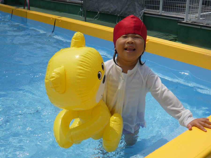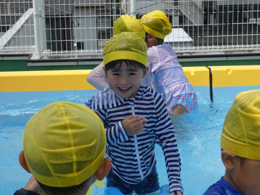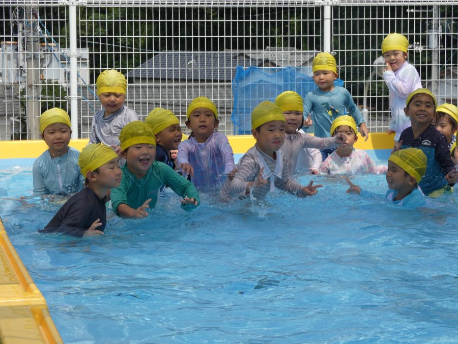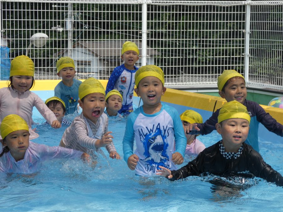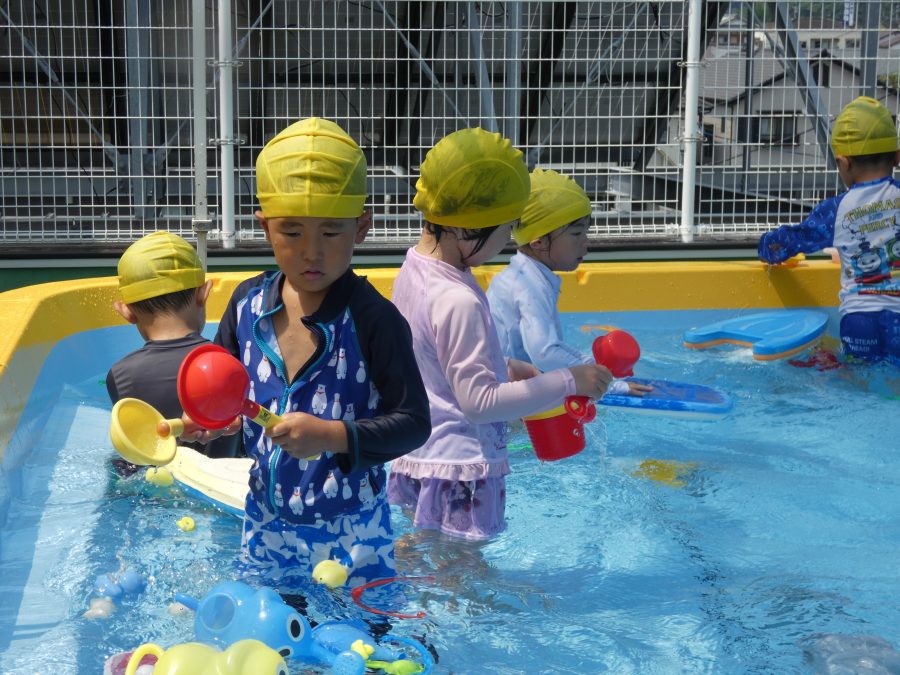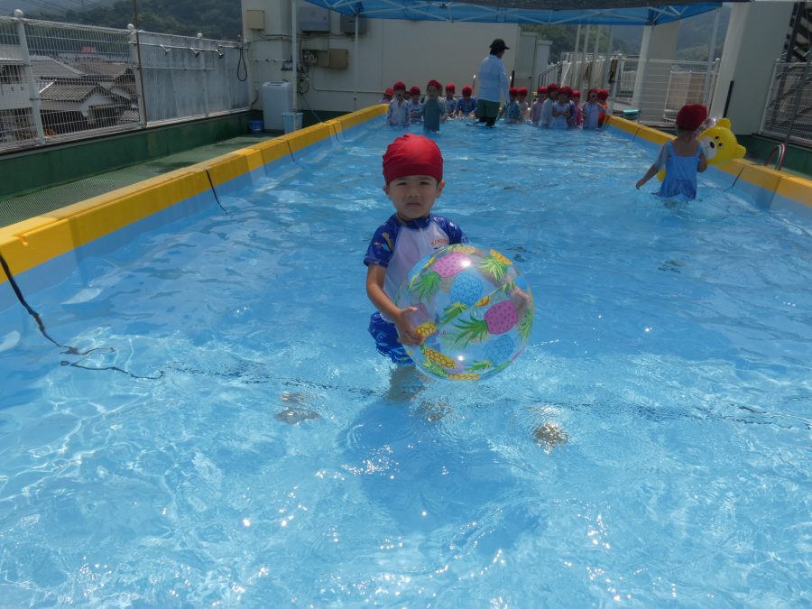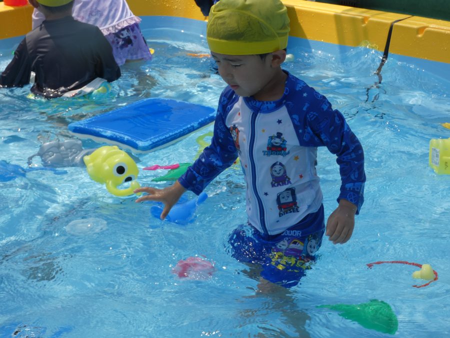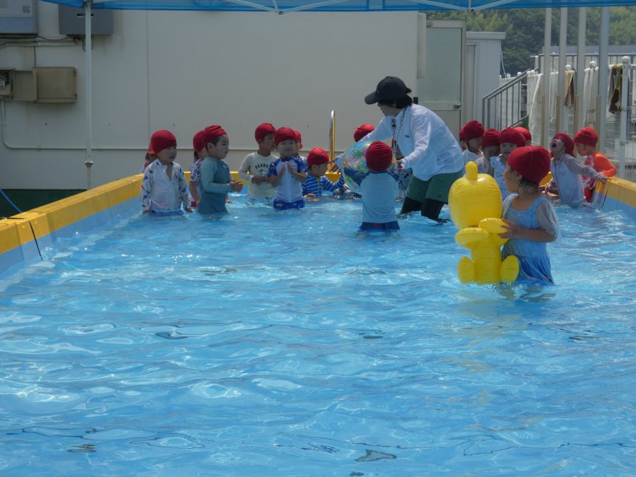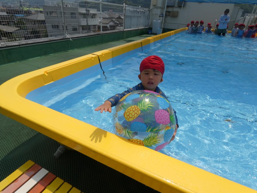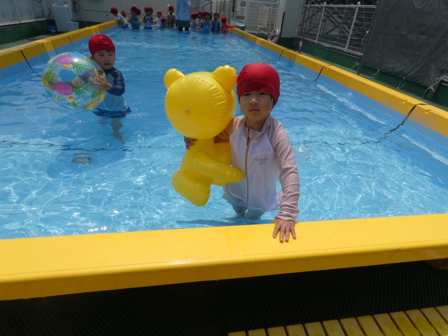 今日は、赤組さんと黄組さんのプール遊びの様子をアップします。赤組さんも黄組さんも水に慣れ、水遊びを楽しんでいます。