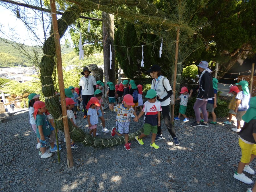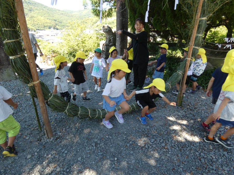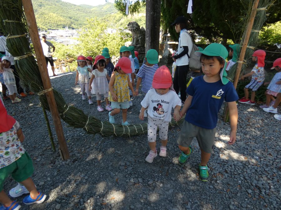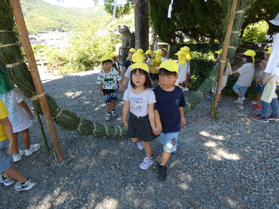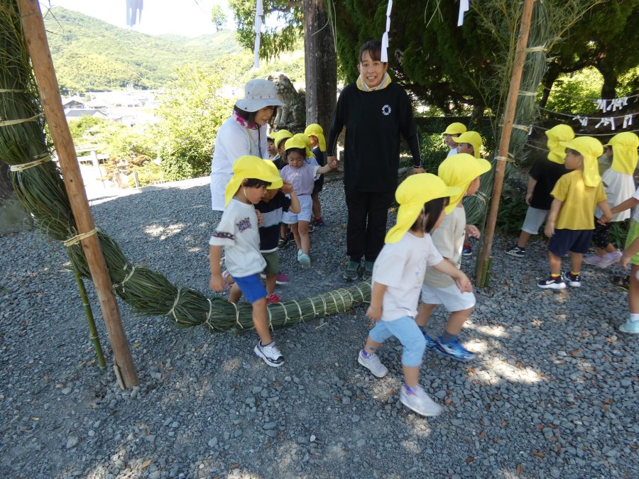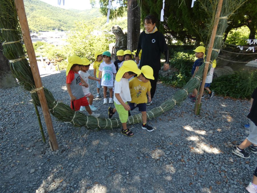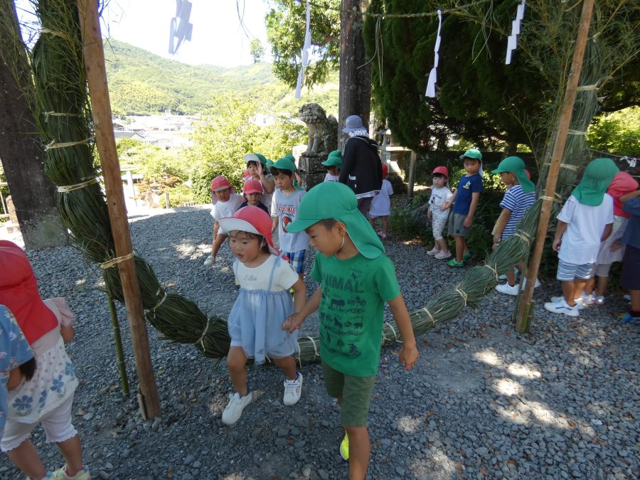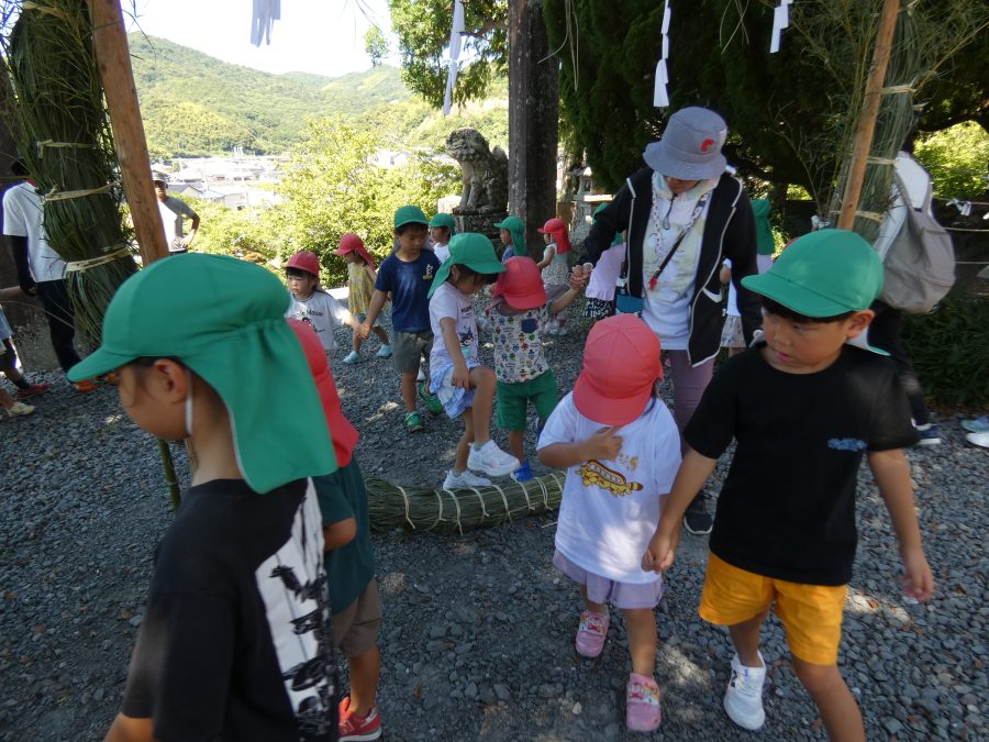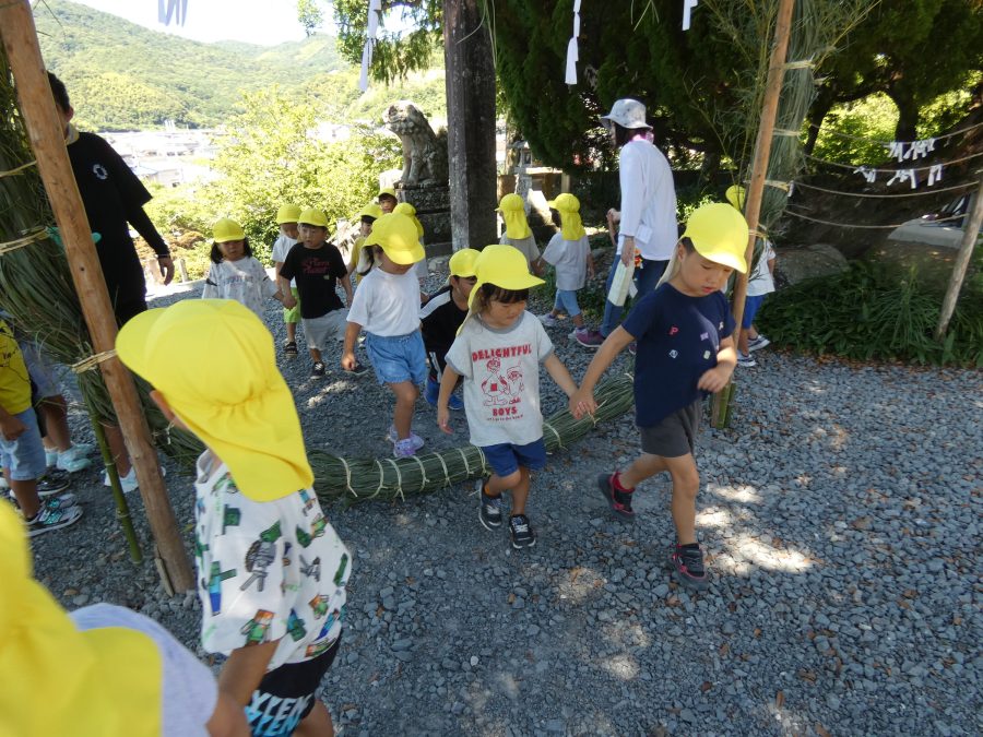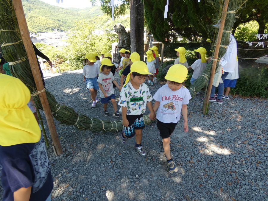 赤組、黄組、緑組さんが「輪抜け」に三島神社に行きました。「輪抜け」は、神前で心身を祓い清め、身体健全・家内安全を祈り明日への活力を養う神事です。暑さにも感染症にも負けず、これからもこども達の健やかな成長を願いたいですね。
