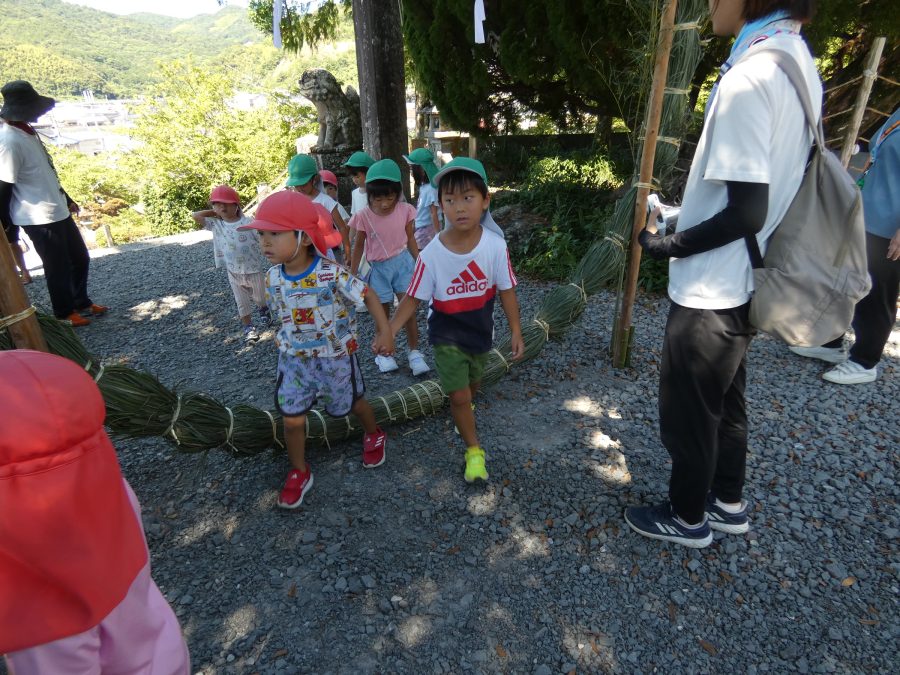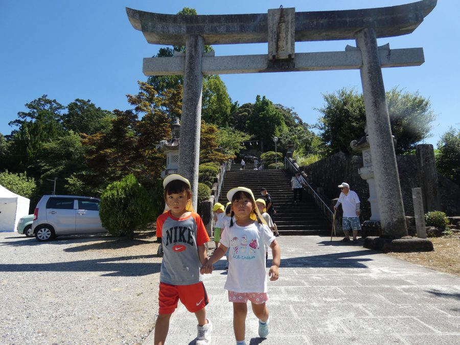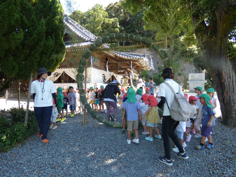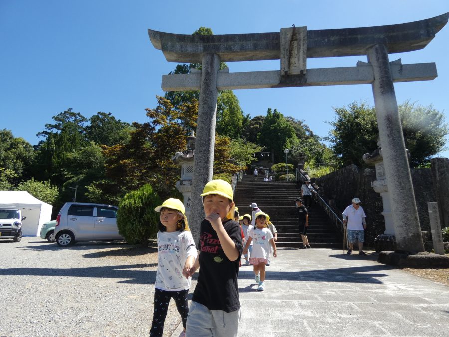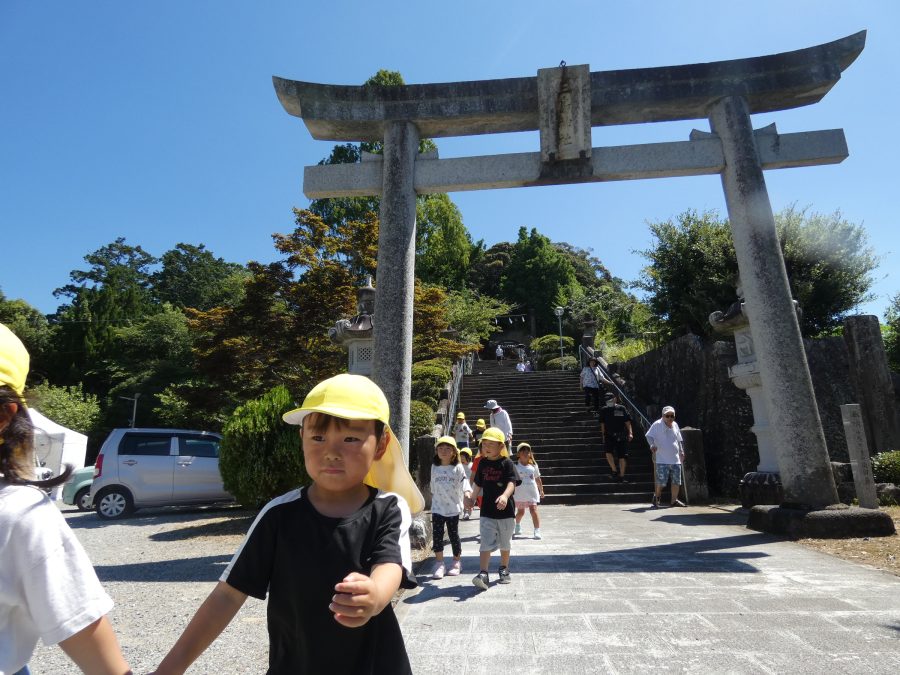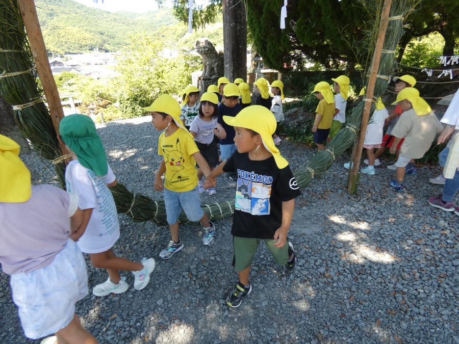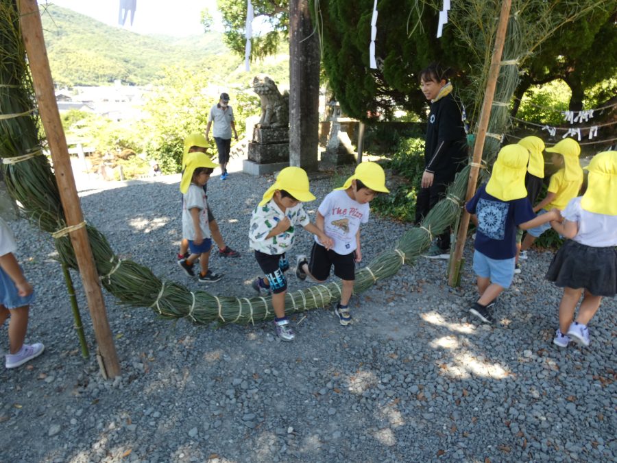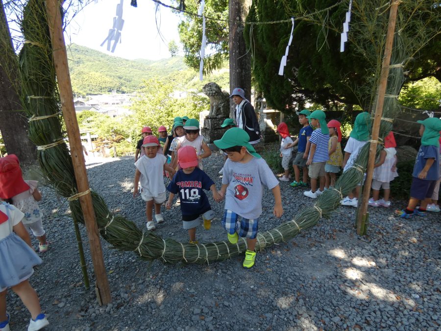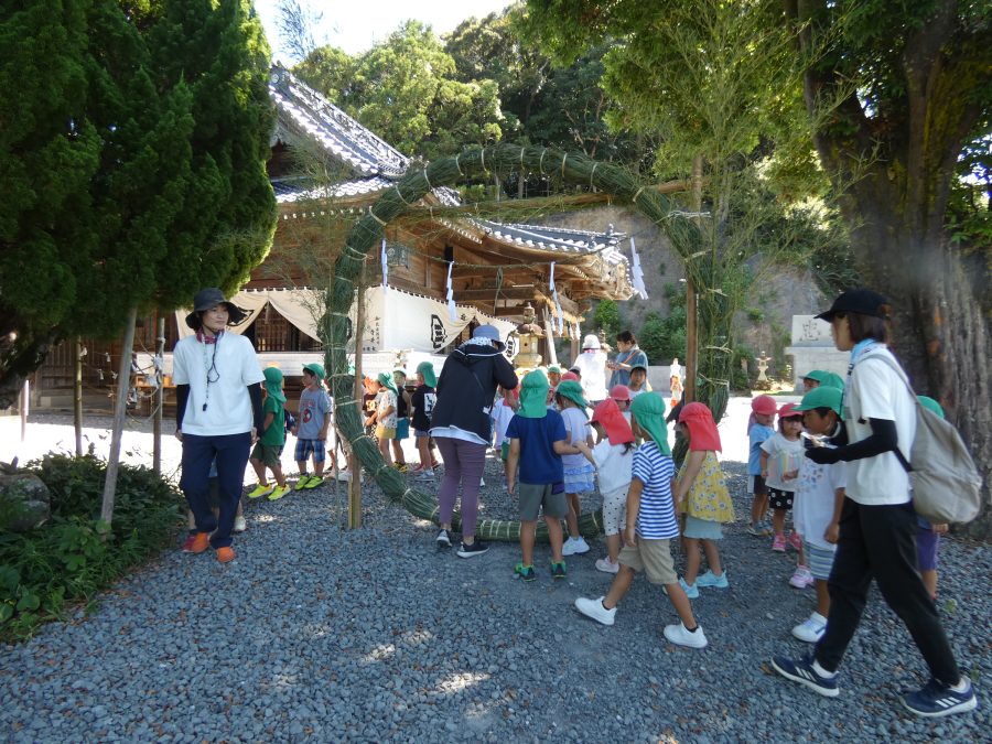 赤組、黄組、緑組さんが「輪抜け」に三島神社に行きました。「輪抜け」は、神前で心身を祓い清め、身体健全・家内安全を祈り明日への活力を養う神事です。暑さにも感染症にも負けず、これからもこども達の健やかな成長を願いたいですね。