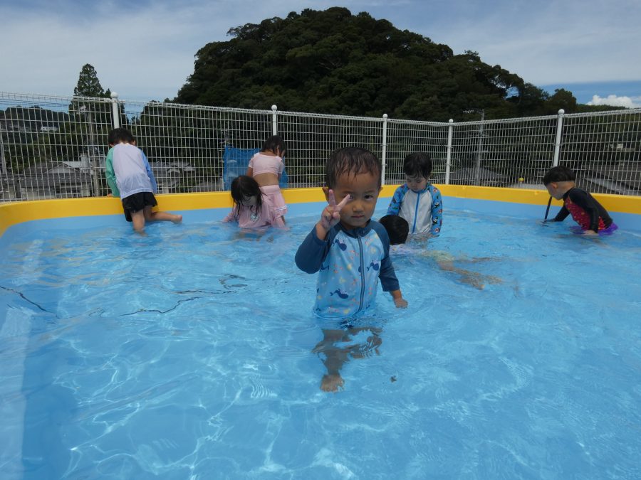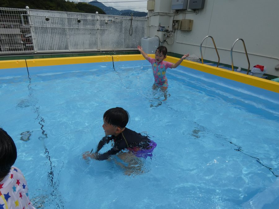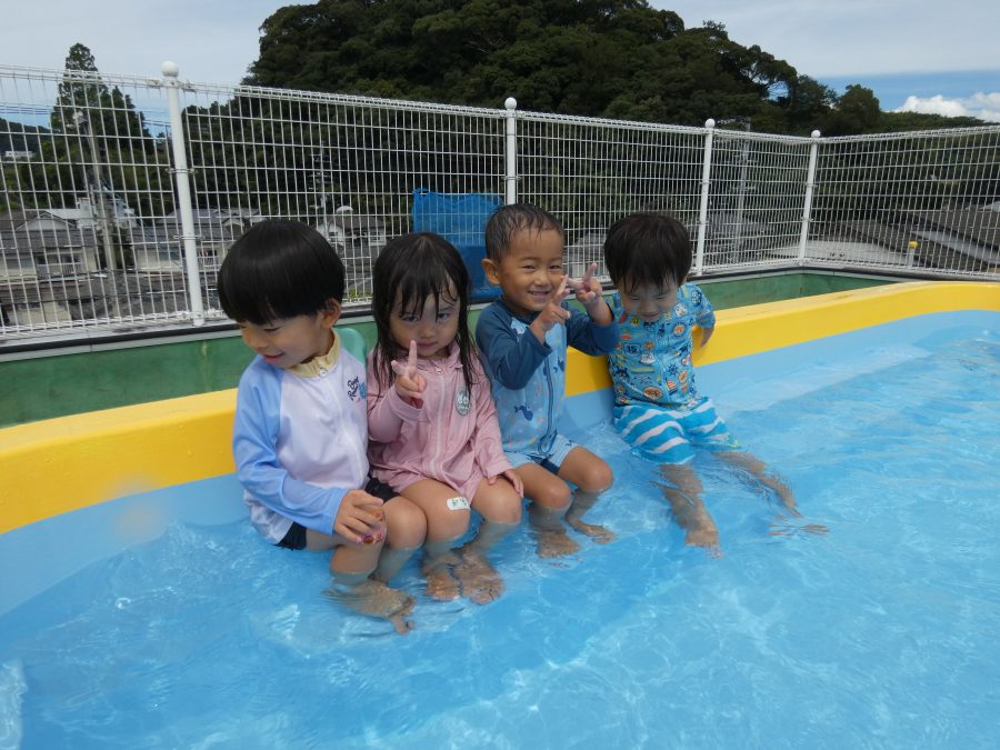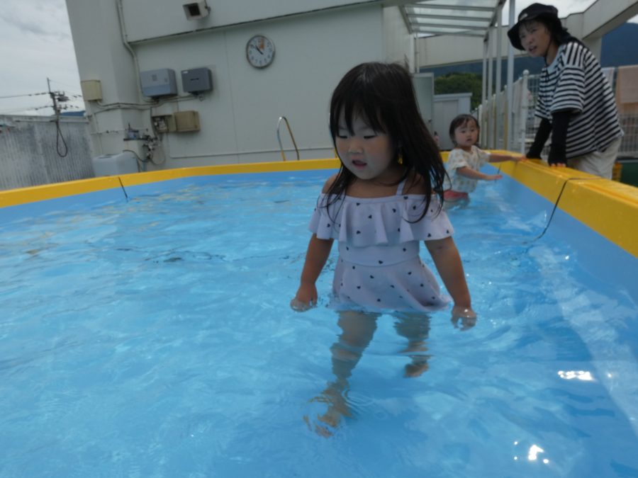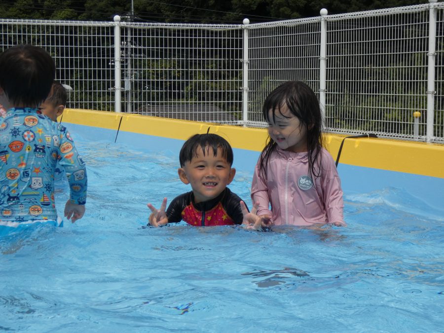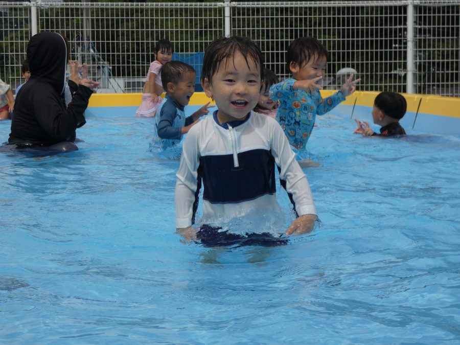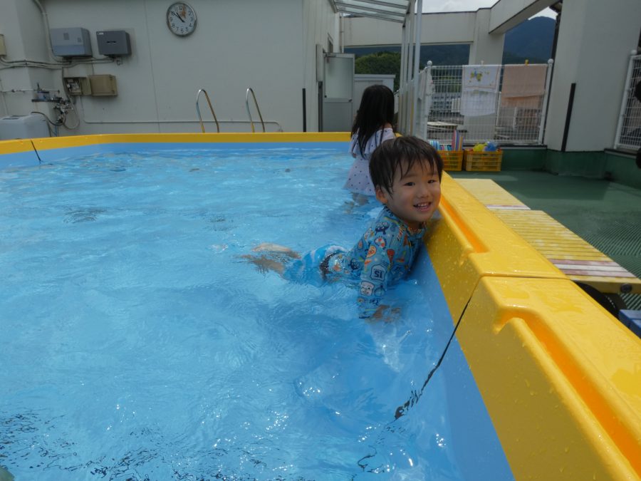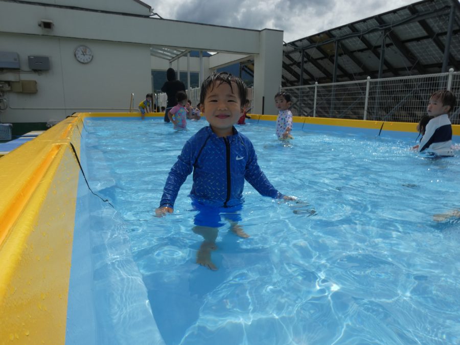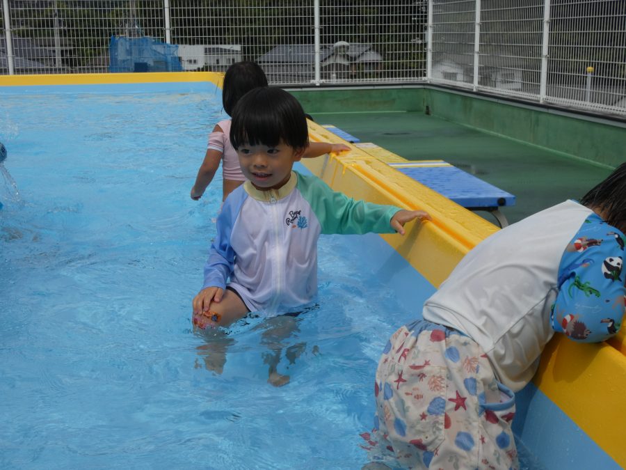 桃2組さんのプール遊びの様子です。今日は、年長さんが使う大きなプールでも遊びました。水深を浅くして遊びました。赤組さんになったら、大きなプールで顔つけやバタ足もがんばって欲しいです。お家でも、お風呂の時など、頭からザーッとお湯を流すなどして、顔に水がかかってもへっちゃらにしておいてもらえるといいですね。
