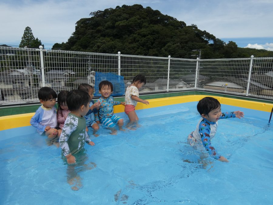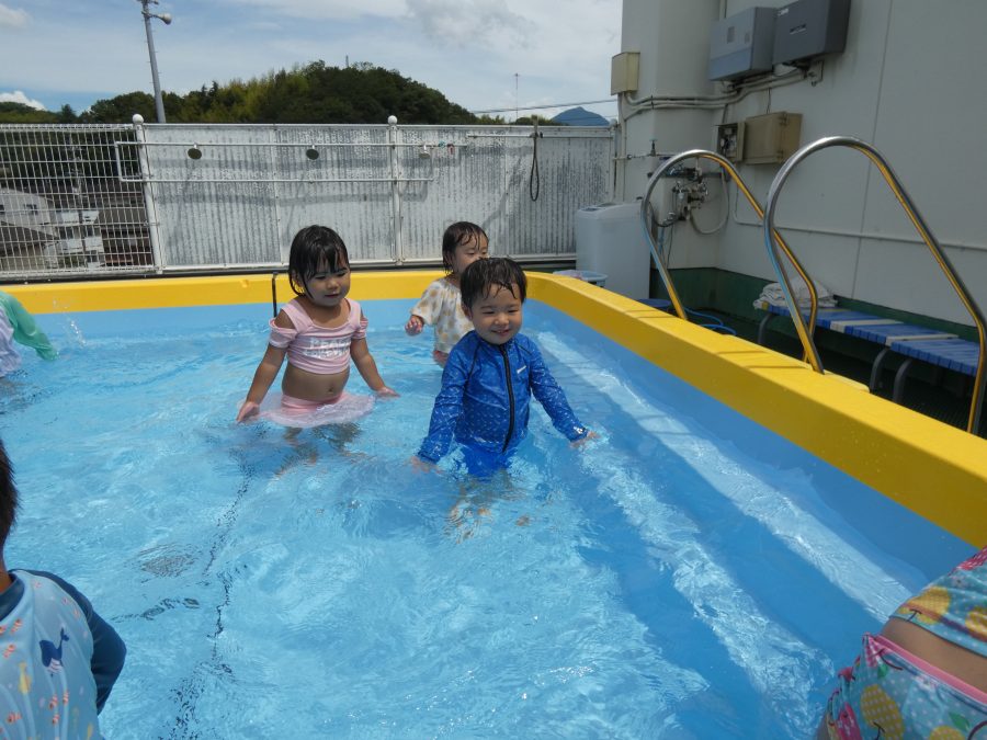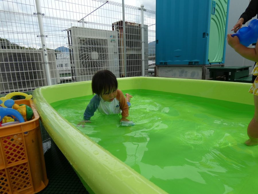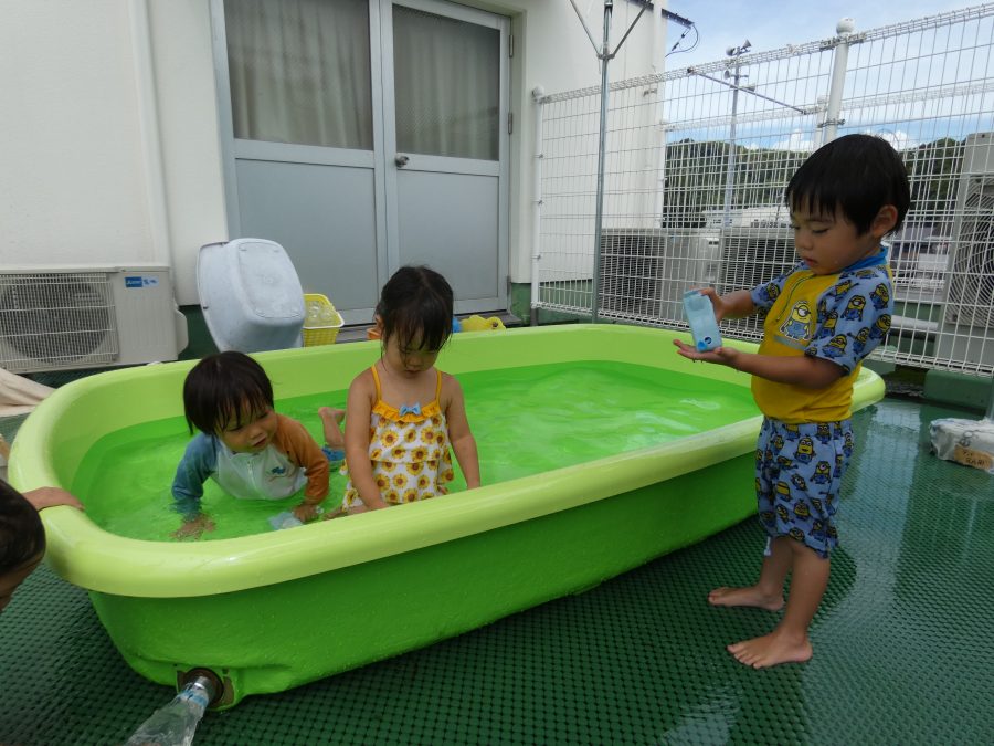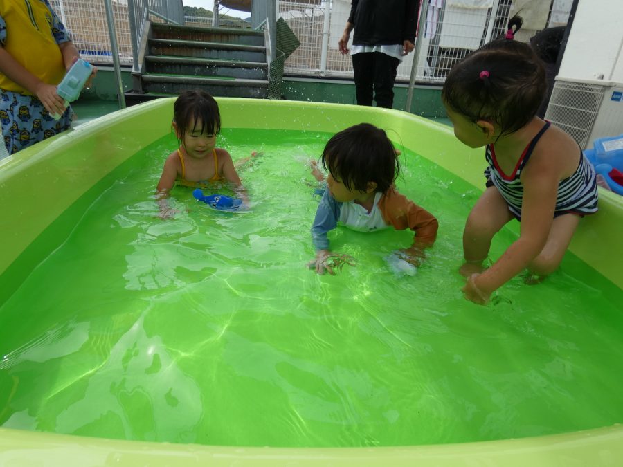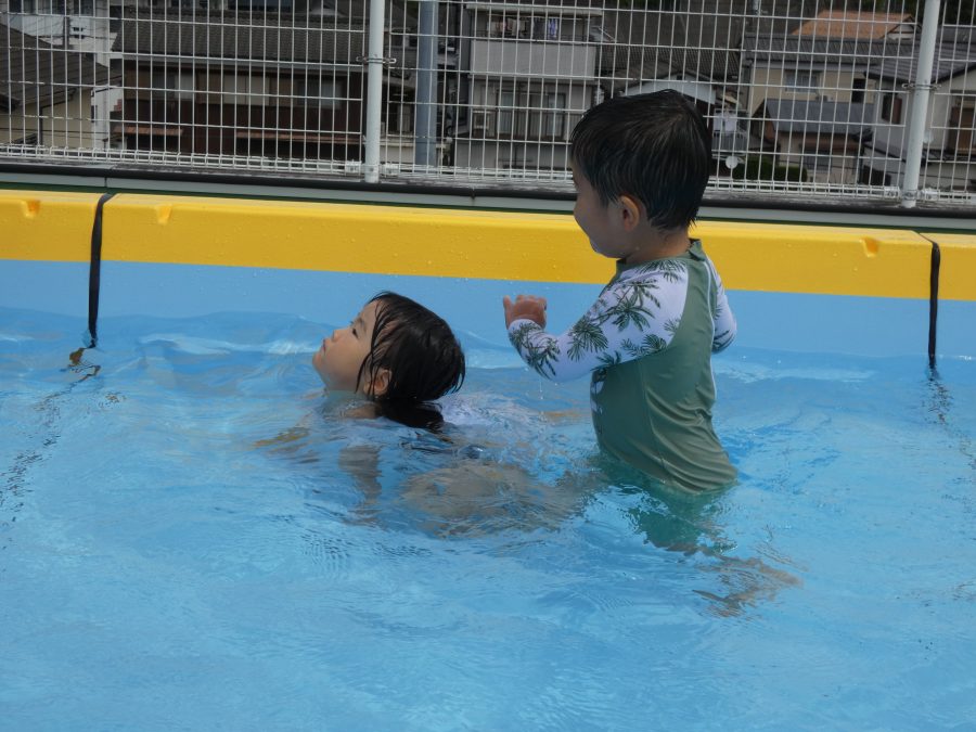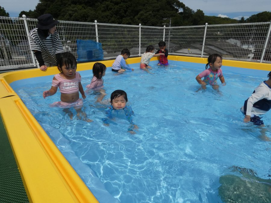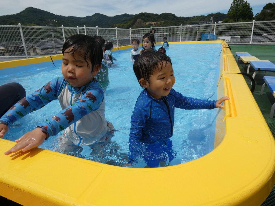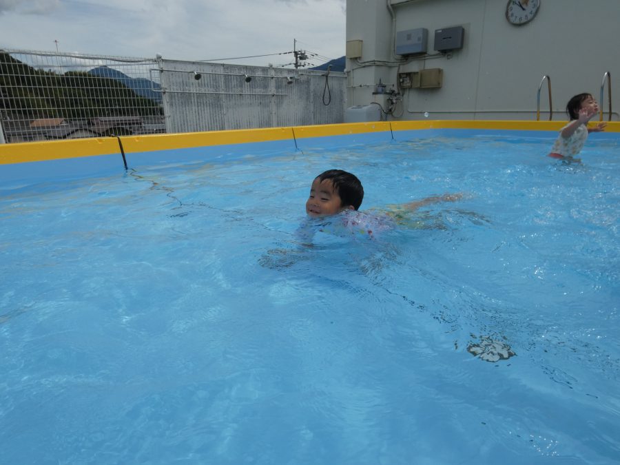 桃2組さんのプール遊びの様子です。今日は、年長さんが使う大きなプールでも遊びました。水深を浅くして遊びました。赤組さんになったら、大きなプールで顔つけやバタ足もがんばって欲しいです。お家でも、お風呂の時など、頭からザーッとお湯を流すなどして、顔に水がかかってもへっちゃらにしておいてもらえるといいですね。