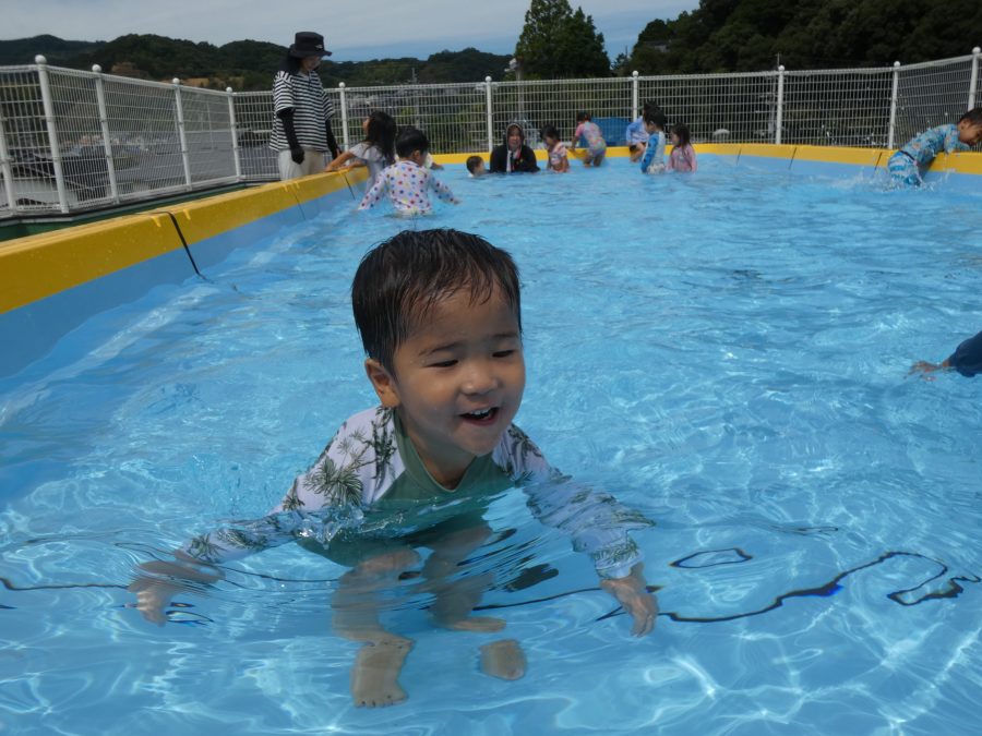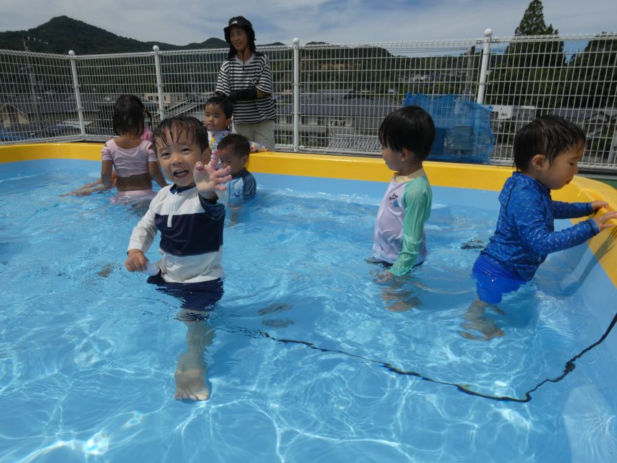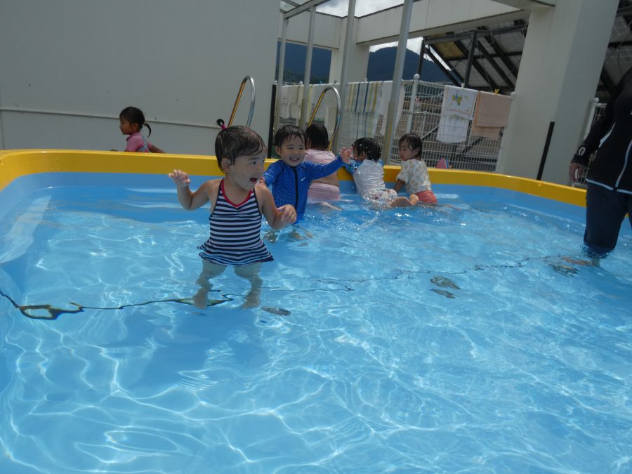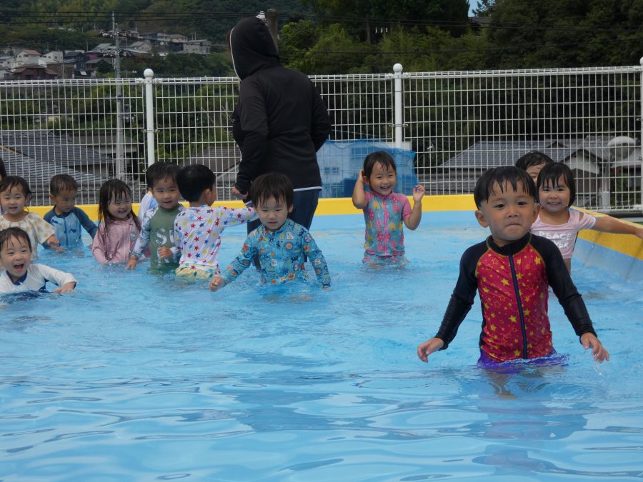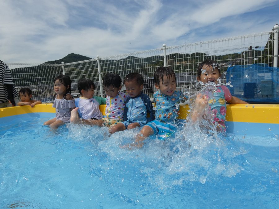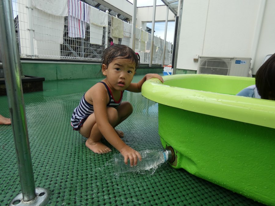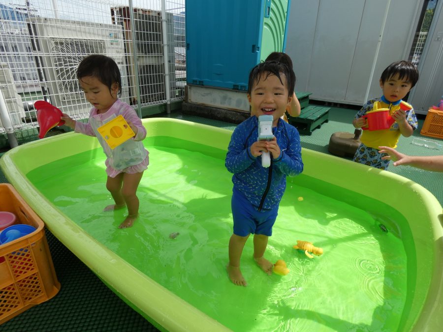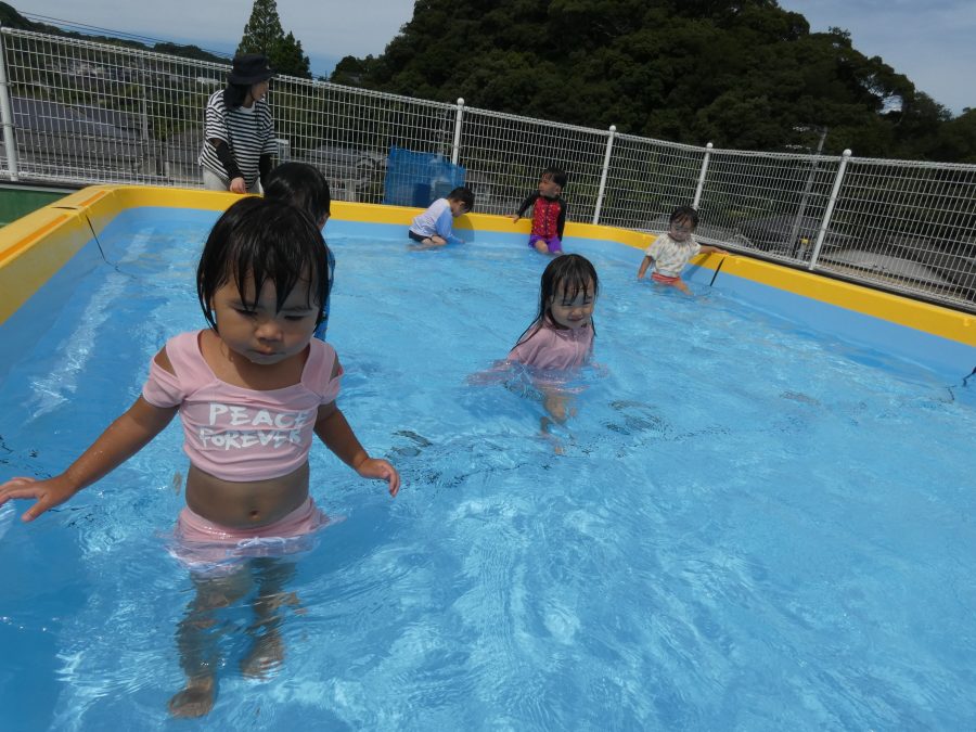 桃2組さんのプール遊びの様子です。今日は、年長さんが使う大きなプールでも遊びました。水深を浅くして遊びました。赤組さんになったら、大きなプールで顔つけやバタ足もがんばって欲しいです。お家でも、お風呂の時など、頭からザーッとお湯を流すなどして、顔に水がかかってもへっちゃらにしておいてもらえるといいですね。