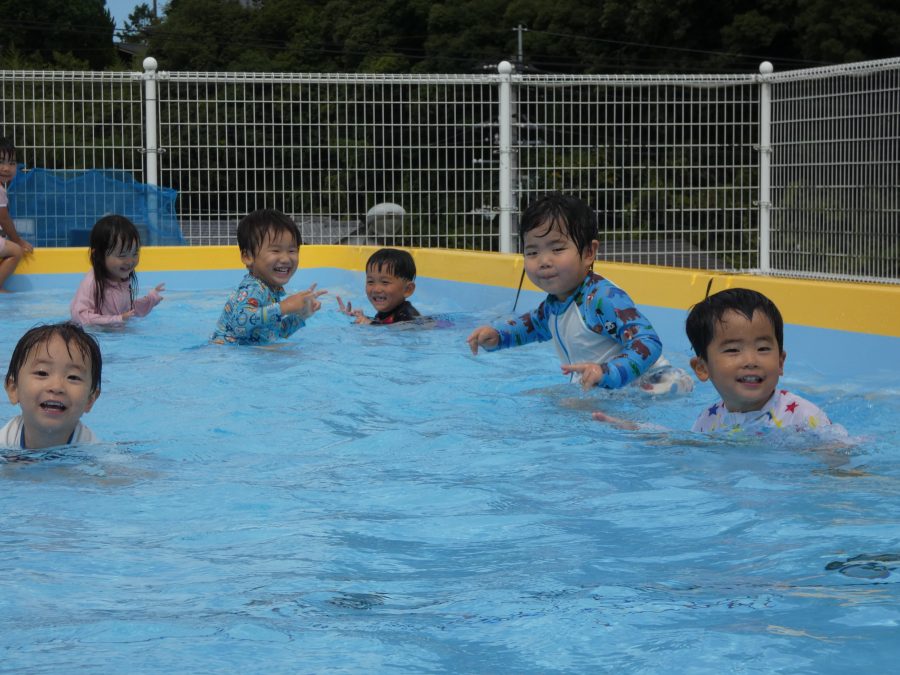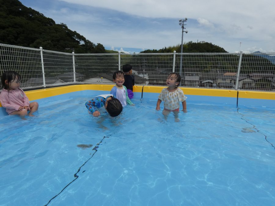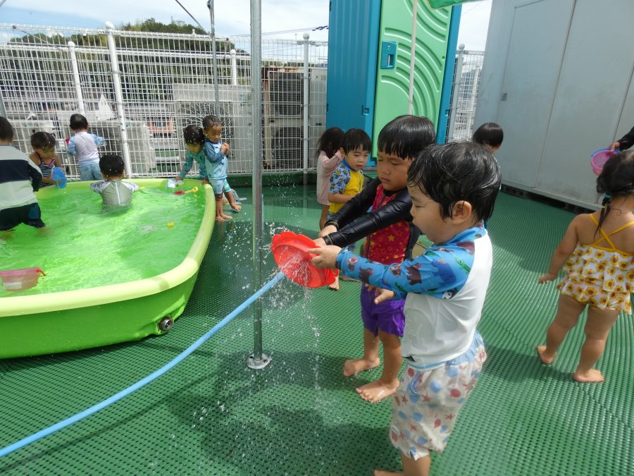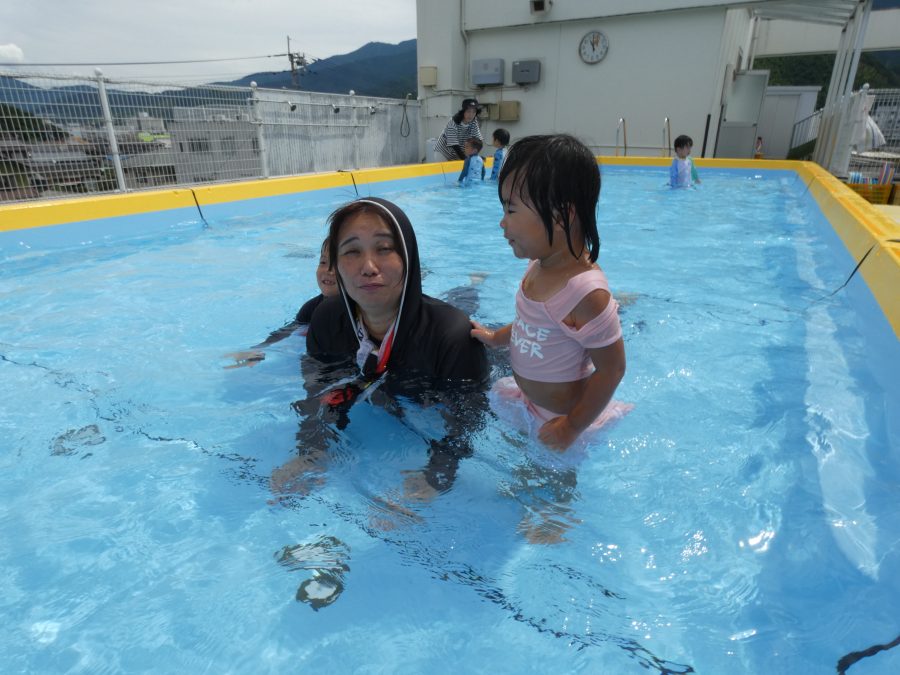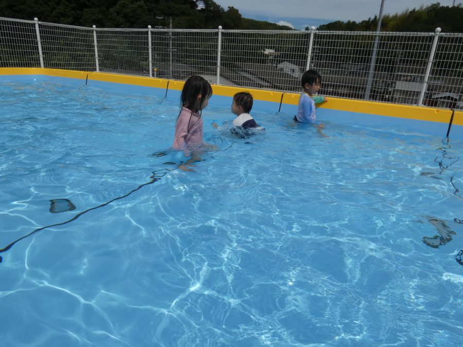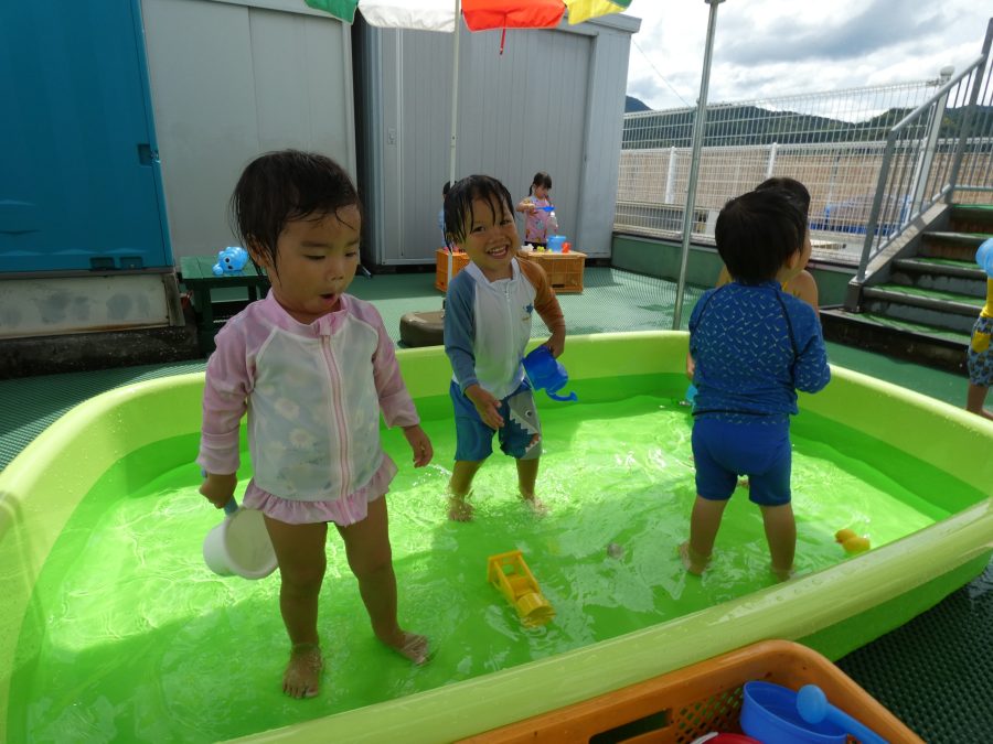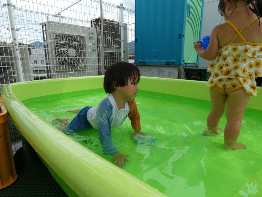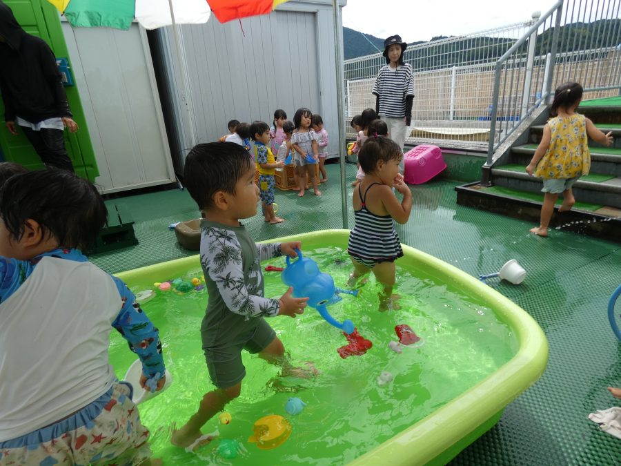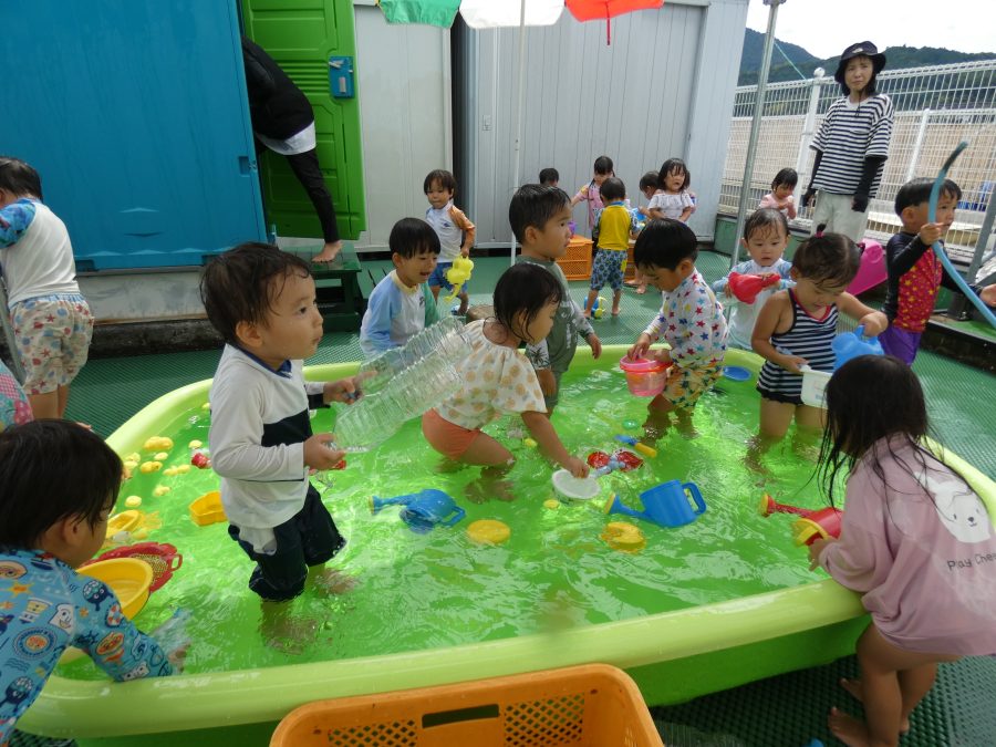 桃2組さんのプール遊びの様子です。今日は、年長さんが使う大きなプールでも遊びました。水深を浅くして遊びました。赤組さんになったら、大きなプールで顔つけやバタ足もがんばって欲しいです。お家でも、お風呂の時など、頭からザーッとお湯を流すなどして、顔に水がかかってもへっちゃらにしておいてもらえるといいですね。