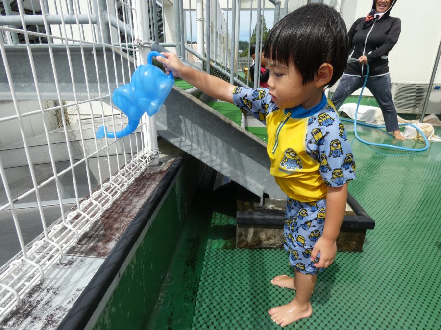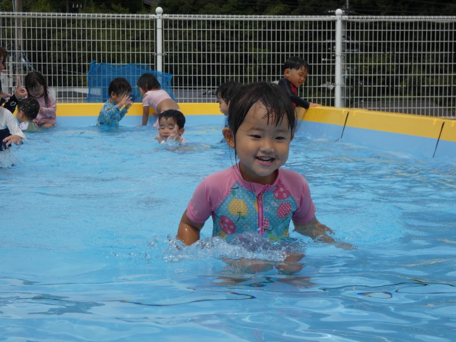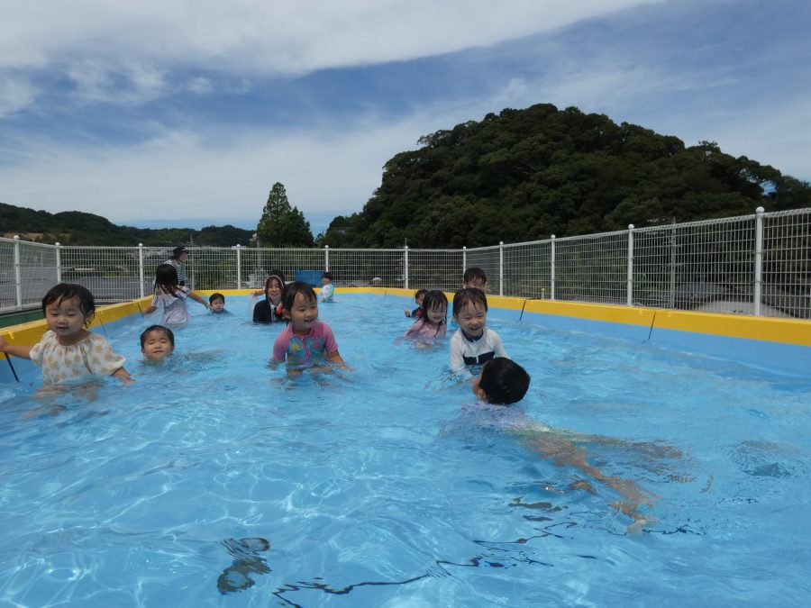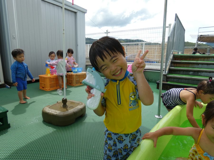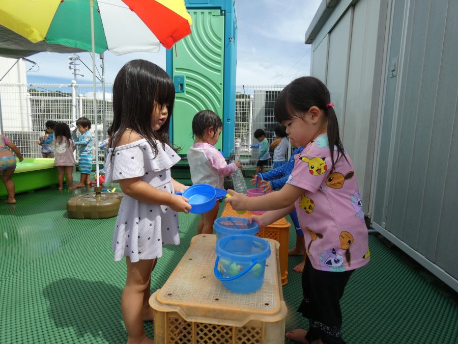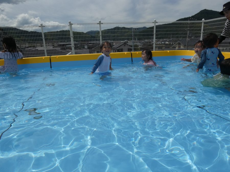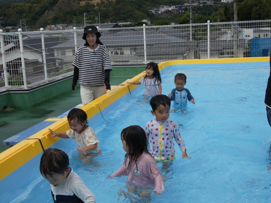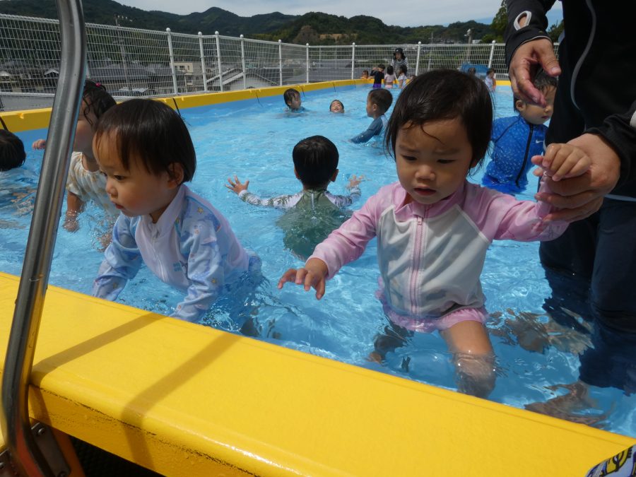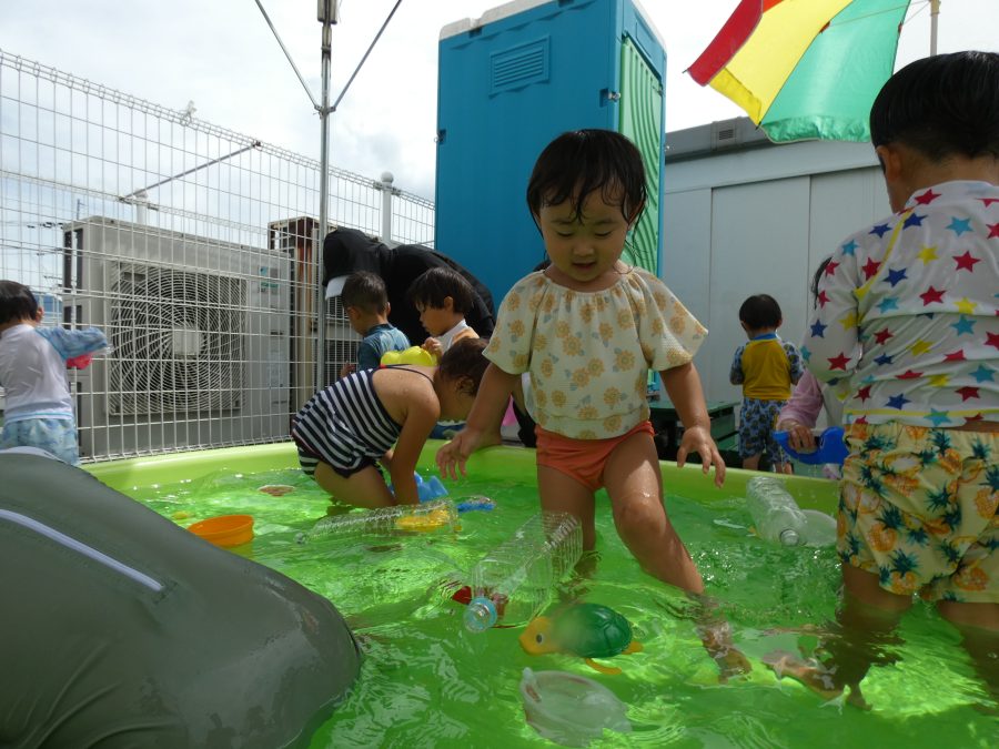 桃2組さんのプール遊びの様子です。今日は、年長さんが使う大きなプールでも遊びました。水深を浅くして遊びました。赤組さんになったら、大きなプールで顔つけやバタ足もがんばって欲しいです。お家でも、お風呂の時など、頭からザーッとお湯を流すなどして、顔に水がかかってもへっちゃらにしておいてもらえるといいですね。