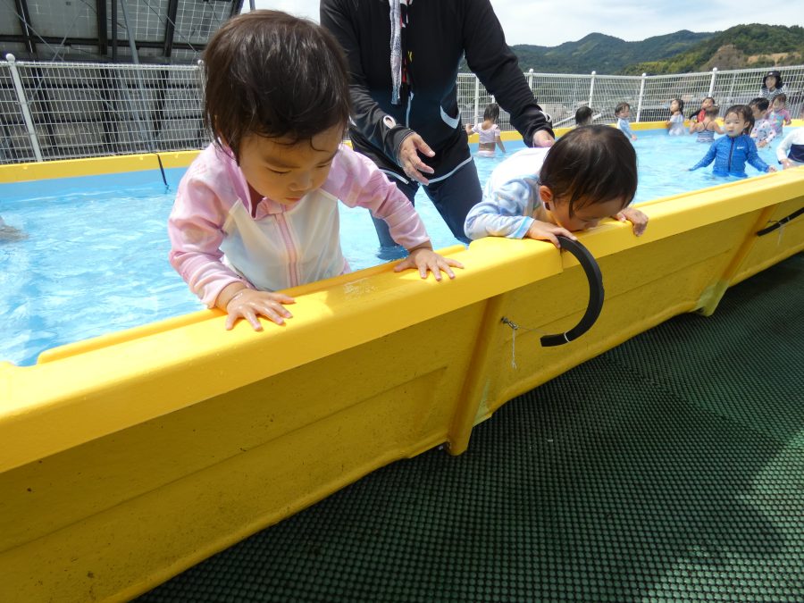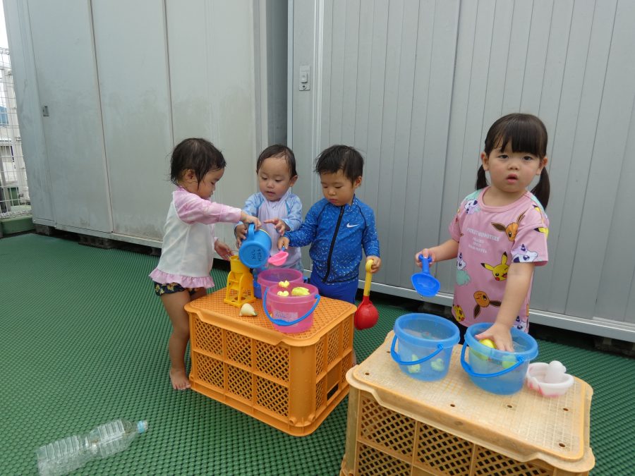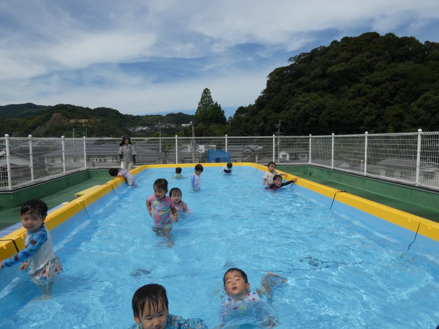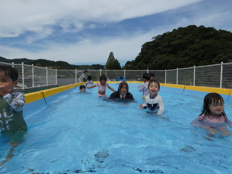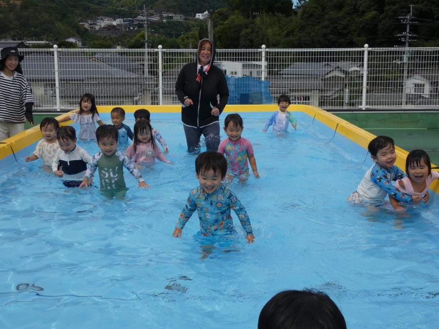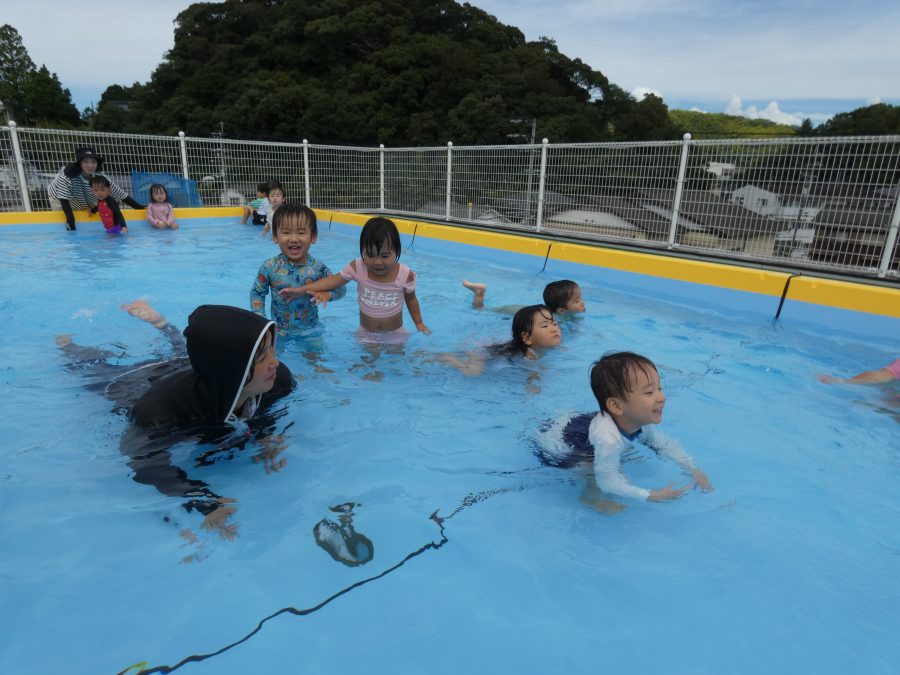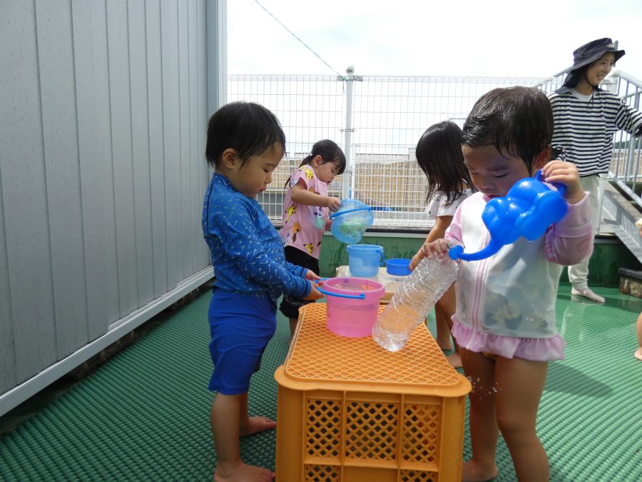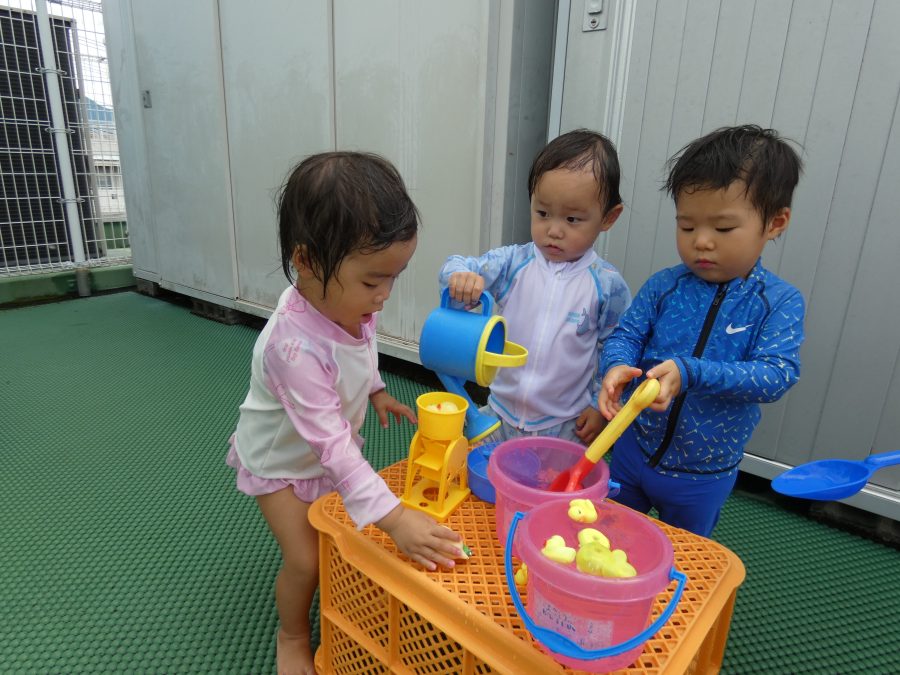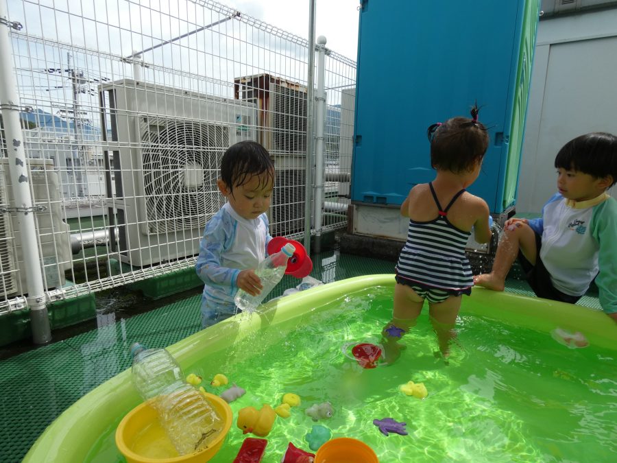 桃2組さんのプール遊びの様子です。今日は、年長さんが使う大きなプールでも遊びました。水深を浅くして遊びました。赤組さんになったら、大きなプールで顔つけやバタ足もがんばって欲しいです。お家でも、お風呂の時など、頭からザーッとお湯を流すなどして、顔に水がかかってもへっちゃらにしておいてもらえるといいですね。