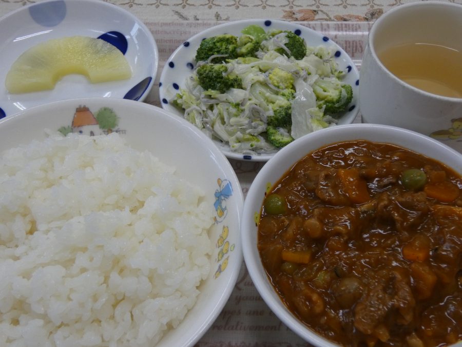 今日のメニューは「ハヤシライス・牛肉、キャベツとブロッコリーのちりめんサラダ、フルーツ」でした。